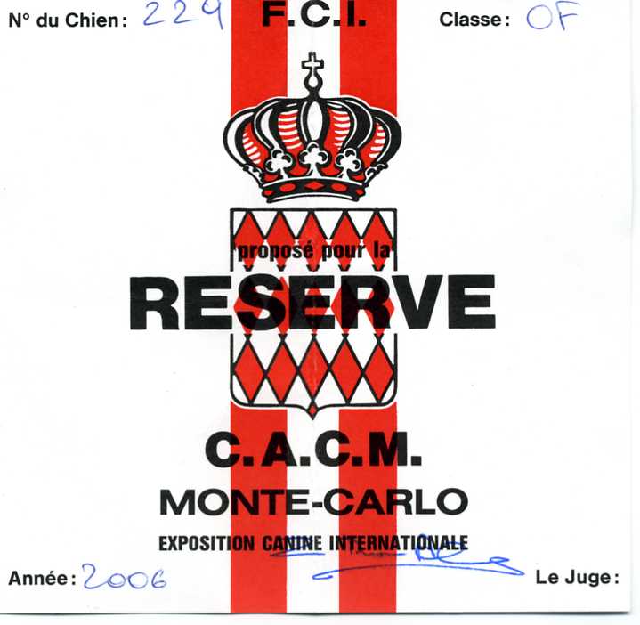 1ère EXCELLENTE RCACM en COF au Championnat de MONACO 2006 à 25 mois
